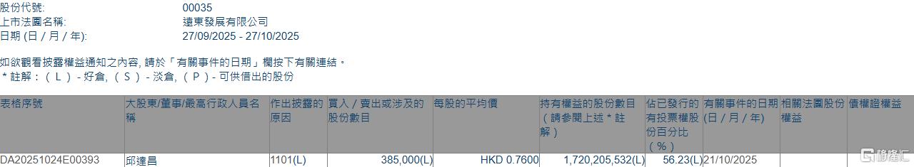 远东发展(00035.HK)获执行董事邱达昌增持38.5万股