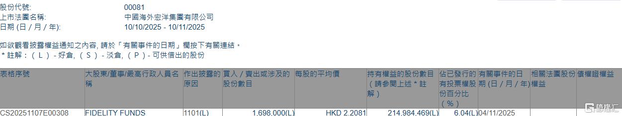 FIDELITY FUNDS增持中国海外宏洋集团(00081)169.8万股 每股作价2.2081港元