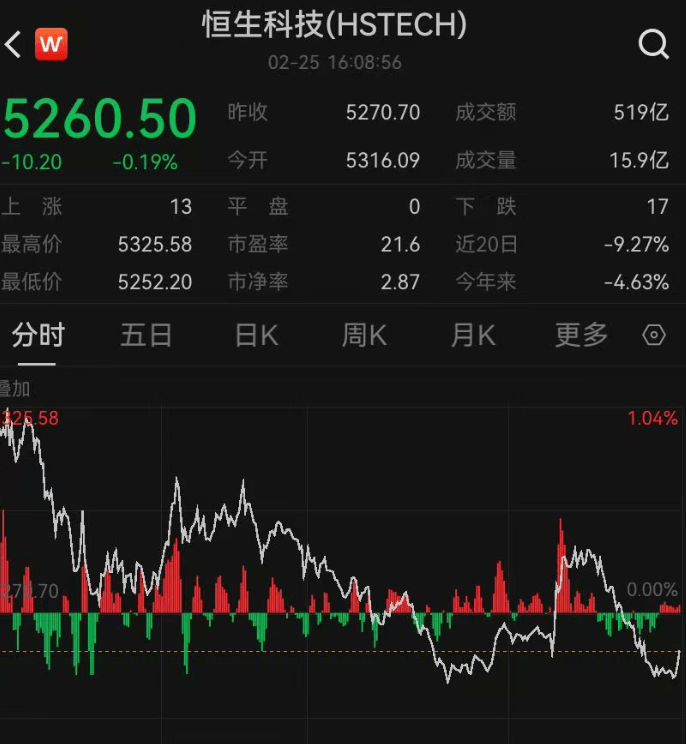港股市场整体表现 - 2月25日港股收盘,恒生指数上涨0.66%,恒生科技指数下跌0.19% [1] - 南向资金当日净流出41亿港元 [1] - 恒生科技指数呈现高开低走态势 [1] 主要指数及板块表现 - 钢铁板块表现强势,Wind香港钢铁II指数上涨3.59%至8865.52点 [2] - 建材板块涨幅居前,Wind香港建材II指数上涨3.04%至6394.75点 [2] - 家电板块上涨,Wind香港家电II指数上涨2.82%至10794.82点 [2] - 有色金属板块上涨,Wind香港有色金属指数上涨2.39%至121416.38点 [2] - 化工板块上涨,Wind香港化工指数上涨2.01%至12172.86点 [2] 大型科技股表现 - 华虹半导体股价上涨1.38% [1] - 中芯国际股价上涨0.65% [1] - 腾讯控股股价上涨0.48% [1] - 阿里巴巴股价上涨0.2% [1] - 小米集团股价下跌0.39% [1] - 百度股价下跌0.62% [1] 半导体及AI相关板块表现 - 半导体板块整体走低,多只个股出现显著下跌 [2] - 天数智芯股价下跌7.61%至237.800港元 [3] - 澜起科技股价下跌7.11%至192.100港元 [3] - 壁仞科技股价下跌5.93%至38.420港元 [3] - 爱芯元智股价下跌5.79%至28.300港元 [3] - 伟志控股股价下跌5.05%至0.940港元 [3] - 普达特科技股价下跌4.92%至0.290港元 [3] - 兆易创新股价下跌4.53%至412.600港元 [3] - 天域半导体股价下跌4.47%至52.400港元 [3] - GEO指数大跌,其中MINIMAX跌幅超过14%,智谱跌幅超过10% [3]