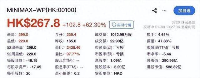 港交所今天彻底被 MiniMax 刷屏了!1 月 9 日,MiniMax(股票代码00100.HK)正式挂牌上市,一开盘 就炸了 —— 开盘价 235.4 港元,比发行价上限 165 港元涨了 42.67%,没多久股价又冲到 267.8 港元, 总市值直接飙到 719 亿港元。 | MINIMAX-WP(HK:00100) | | | 加目洗 | | --- | --- | --- | --- | | HK$267.8 +102.8 +62.30% | | 文实时行情 | 3720 球友关注 交易中 01-09 10:27:36 北京时间 | | 世高:299.0 | 今开:235.4 | 成交量:1012.99万股 | 换手:4.61% | | 最低:220.0 | 昨收:165.0 | 成交额:22.90亿 | 纸帽:47.88% | | 52周最高:299.0 | 量比:2438.46 | 市盈率(动): 亏损 | 市盈率(TTM): 亏损 | | 52周最低:220.0 | 委比: 97.77% | 市盈率(靜): 亏损 | 市海军:5.46 | | 每股收益:-48.15 | 股息(TTM): -- ...