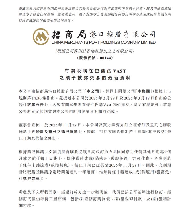 交易核心条款修订 - 招商局港口与买方和卖方于2025年11月27日订立经修订及重列的购股协议,涉及收购巴西阿苏港VAST原油码头项目70%权益 [1] - 交易截止日期延长至2026年11月28日,预计交割将比原定时间延迟约一年 [3] - 根据修订协议,买方在交割时应付的购买价调整为3.5亿美元(约27.3亿港元),但代价上限不得超过5.96亿美元(约46.52亿港元) [3] 标的资产概况与行业地位 - VAST码头是巴西唯一可接卸VLCC(超大型油轮)开展原油过驳作业的非巴西国家石油公司营运的私营石油码头 [5] - 巴西约30%的原油出口通过该码头运输 [5] - 该码头平均每天处理约56万桶原油,目前其许可处理能力为每天120万桶 [5]