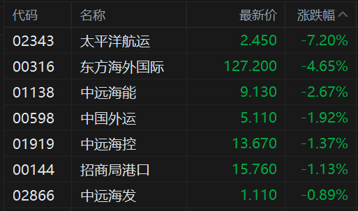 港股港口及海运股大幅走低,其中,太平洋航运跌超7%表现最弱,东方海外国际跌4.6%,中远海能跌 2.67%,中国外运、中远海控、招商局港口、中远海发皆下跌。 有分析称,波罗的海干散货运价指数(BDI)跌至近两周低位,主要反映了近期全球大宗商品海运需求 出现短期波动或走弱。BDI是干散货航运公司即期运费收入的晴雨表。指数下跌意味着船东在当前市场 上收取的运费减少,直接削弱了市场对公司未来季度盈利能力的预期。 | 代码 | 名称 | 最新价 | 涨跌幅 へ | | --- | --- | --- | --- | | 02343 | 太平洋航运 | 2.450 | -7.20% | | 00316 | 东方海外国际 | 127.200 | -4.65% | | 01138 | 中远海能 | 9.130 | -2.67% | | 00598 | 中国外运 | 5.110 | -1.92% | | 01919 | 中远海控 | 13.670 | -1.37% | | 00144 | 招商局港口 | 15.760 | -1.13% | | 02866 | 中远海发 | 1.110 | -0.89% | 消息上,波罗的海干 ...