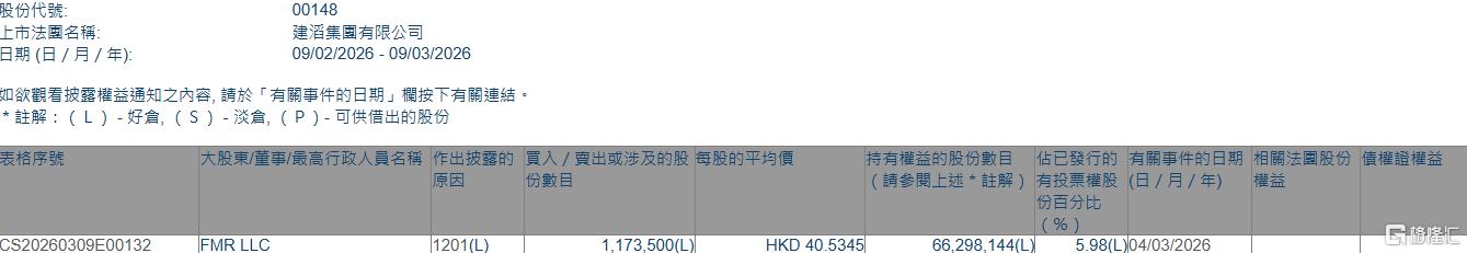 FMR LLC减持建滔集团(00148)117.35万股 每股作价约40.53港元