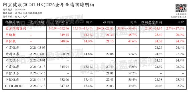 阿里健康全年业绩预期 - 截至2026年03月04日,卖方机构对阿里健康2026财年业绩的预测区间为:营业收入345.94亿元至352.96亿元,同比增长13.1%至15.4%;净利润20.03亿元至22.86亿元,同比增长39.8%至59.6%;经调整净利润20.03亿元至24.93亿元,同比增长2.7%至27.9% [1][3][6] - 卖方预测的平均数为:营业收入349.15亿元(同比增长14.1%),净利润21.30亿元(同比增长48.7%),经调整净利润23.40亿元(同比增长20.0%) [3][8] - 卖方预测的中位数为:营业收入348.86亿元(同比增长14.0%),净利润21.15亿元(同比增长47.6%),经调整净利润24.32亿元(同比增长24.7%) [3][8] 主要卖方机构具体预测 - 财通证券(2026-03-03)预测最为乐观:营业收入350.59亿元(同比增长14.6%),净利润22.86亿元(同比增长59.6%),经调整净利润24.93亿元(同比增长27.9%) [3][8] - 中信证券(2026-01-15)预测:营业收入352.96亿元(同比增长15.4%),净利润22.41亿元(同比增长56.4%),经调整净利润24.38亿元(同比增长25.0%) [3][8] - CITIGROUP(2026-01-13)预测相对保守:营业收入347.12亿元(同比增长13.4%),净利润20.03亿元(同比增长39.8%),经调整净利润20.03亿元(同比增长2.7%) [3][8] 公司业务基本面与增长动力 - 公司是国内线上B2C医疗健康零售平台的领先者,业务覆盖医药自营、医药电商平台、医疗健康及数字化服务等多元领域 [4][9] - 医药自营与电商平台增长强劲:平台年化活跃消费者超过3亿,SKUs同比增长超24%至9,700万个,服务商家数同比增长超39%至超过5.6万家 [4][5][9] - 公司持续推进大模型在医药电商场景的落地,应用于搜推优化、智慧供应链、商品运营及智能客服等环节,以提升效率并创造GMV增量 [4][6][9] 战略协同与AI生态布局 - 阿里系应用正构建“AI入口+垂类服务”的流量闭环,其中蚂蚁阿福App月活已超过1500万,千问App月活突破2亿 [4][6][9] - 若上述AI入口进一步接入公司的医药电商、在线问诊等服务能力,有望打通“问诊—购药/服务预约—履约”的完整链路,从而提升交易效率与用户复购黏性 [4][6][10]