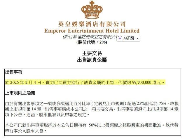 核心观点 - 英皇娱乐酒店公告确认已出售其酒店大堂地砖下镶嵌的78公斤黄金 售价近1亿港元 并预计将确认巨额收益 市场对此反应积极 公司股价在公告后次日大幅上涨 [2][8][13] 公司资产处置与财务影响 - 公司出售了澳门英皇娱乐酒店大堂“黄金大道”下镶嵌的黄金 总重量超过78公斤(78块 总重78公斤) 买家为专业贵金属企业贺利氏金属香港有限公司 [2][6] - 该批黄金的出售价格为近1亿港元 [2] - 该黄金原作为物业、厂房及设备入账 账面价值仅为940万港元(即原始购入成本) 扣除交易费用后 预计出售将确认收益约9020万港元 [9] - 公司解释出售原因是当前黄金市场价格处于高位 是释放资产价值的良好机会 同时未来可节省相关的保安及保险费用 [8] 公司业务与背景 - 英皇娱乐酒店有限公司主要从事酒店服务 在香港及澳门运营多家酒店及租赁公寓 在澳门运营英皇娱乐酒店和澳门盛世酒店 在香港运营英皇骏景酒店及The Unit品牌下的三幢租赁公寓 [9] - 澳门英皇娱乐酒店此前曾设有“英皇宫殿娱乐场” 该娱乐场已于2025年10月30日停止运营 目前该地点仅保留酒店业务 [11] - “黄金大道”是澳门英皇娱乐酒店的标志性景观 过去20年用于营造奢华氛围以提升品牌形象并吸引人流 [8] 市场反应与事件时间线 - 在2月4日晚间发布出售黄金公告后 公司股价(00296.HK)于2月5日开盘一度大涨超过20% 截至发稿时涨幅为9.76% [13] - 事件起源于1月底 有网友发现酒店大堂地砖内的黄金消失 酒店工作人员最初回应称系因内部装修需要而于1月29日晚撤走 与金价无关 并称装修后会再展出 但后续公告证实黄金已被出售 [4][8]