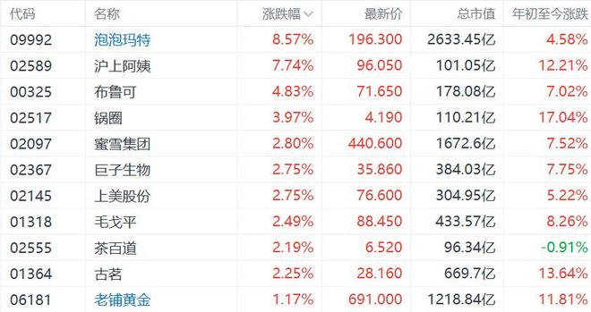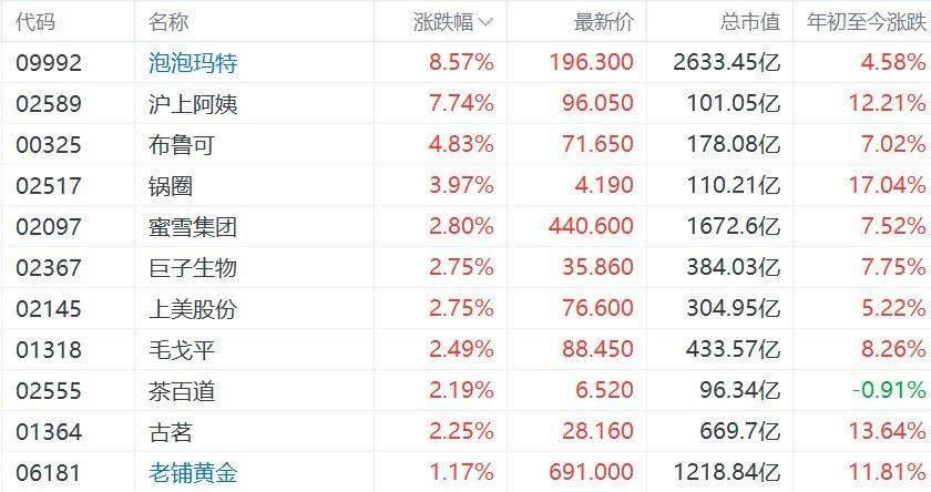 港股新消费概念股回暖,沪上阿姨(02589.HK)盘中一度涨超10%,泡泡玛特(09992.HK)涨10.2%,布鲁可(00325.HK)涨超7%,古茗...