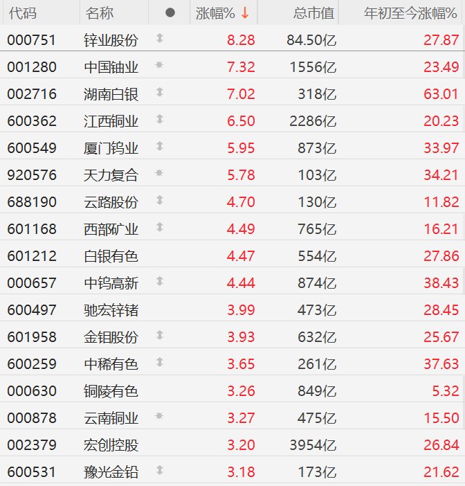 市场表现 - A股有色金属板块集体走强,多只个股股价大幅上涨并创下历史新高 [1] - 锌业股份盘中一度涨停,收盘涨幅为8.28% [1][2] - 中国铀业和湖南白银涨幅均超过7%,分别为7.32%和7.02% [1][2] - 江西铜业上涨6.50%,总市值达2286亿人民币,股价创历史新高 [1][2] - 厦门钨业上涨5.95%,总市值873亿人民币,股价创历史新高 [1][2] - 云路股份、西部矿业、白银有色、中钨高新涨幅均超过4% [1] 驱动因素 - 消息面上,金、银、铜、锡四种金属价格在同一时间均刷新历史新高 [1] - 分析人士认为,这反映出投资者对委内瑞拉、伊朗等地缘政治紧张局势的担忧 [1] - 在地缘政治和贸易格局重塑之际,投资者正在重新评估资产配置 [1] - 分析观点认为,金价和银价仍有进一步上涨的空间 [1] 个股数据 - 锌业股份年初至今涨幅为27.87%,总市值84.50亿人民币 [2] - 中国铀业年初至今涨幅为23.49%,总市值1556亿人民币 [2] - 湖南白银年初至今涨幅高达63.01%,总市值318亿人民币 [2] - 江西铜业年初至今涨幅为20.23% [2] - 厦门钨业年初至今涨幅为33.97% [2] - 天力复合上涨5.78%,年初至今涨幅34.21%,总市值103亿人民币 [2] - 云路股份年初至今涨幅为11.82%,总市值130亿人民币 [2] - 西部矿业年初至今涨幅为16.21%,总市值765亿人民币 [2] - 白银有色年初至今涨幅为27.86% [2] - 中钨高新年初至今涨幅为38.43%,总市值874亿人民币 [2] - 驰宏锌锗上涨3.99%,年初至今涨幅28.45%,总市值473亿人民币 [2] - 金钼股份上涨3.93%,年初至今涨幅25.67%,总市值632亿人民币 [2] - 中稀有色上涨3.65%,年初至今涨幅37.63%,总市值261亿人民币 [2] - 铜陵有色上涨3.26%,年初至今涨幅5.32%,总市值849亿人民币 [2] - 云南铜业上涨3.27%,年初至今涨幅15.50%,总市值475亿人民币 [2] - 宏创控股上涨3.20%,年初至今涨幅26.84% [2] - 豫光金铅上涨3.18%,年初至今涨幅21.62%,总市值173亿人民币 [2]