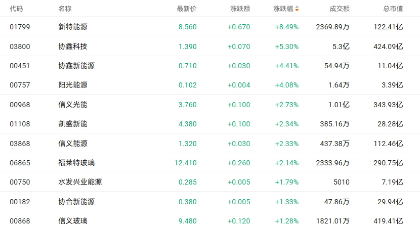 申万宏源发布研报称,多晶硅为反内卷的核心抓手,联合平台的成立有助于多晶硅供给侧改革的加速推进。反内卷持 续推进,行业价格和盈利修复明显。2025年三季度,多晶硅行业在"不低于成本销售"的价格法规要求下开始提涨,逐 步恢复至综合成本线之上。 编辑/jayden | 代码 | 名称 | 最新价 | 涨跌额 | 涨跌幅 ◆ | 成交额 | | | --- | --- | --- | --- | --- | --- | --- | | 01799 | 新特能源 | 8.560 | +0.670 | +8.49% | 2369.89万 | 122.41亿 | | 03800 | 协鑫科技 | 1.390 | +0.070 | +5.30% | 5.3亿 | 424.09亿 | | 00451 | 协鑫新能源 | 0.710 | +0.030 | +4.41% | 54.94万 | 11.04亿 | | 00757 | 阳光能源 | 0.102 | +0.004 | +4.08% | 1.64万 | 3.39亿 | | 00968 | 信义光能 | 3.760 | +0.100 | +2.73% | 1.01亿 | 34 ...