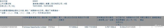 公司股权变动 - 2026年1月13日,Formosa Opportunity Limited在场内增持豪威集团(00501.HK) 11.79万股,每股均价114.6353港元,涉资约1351.55万港元 [1] - 增持后,Formosa Opportunity Limited最新持股数目增至376.71万股,持股比例由7.97%上升至8.23% [1] - 此次权益披露的日期范围为2025年1月15日至2026年1月15日,相关表格序号为CS20260114E00125 [2]