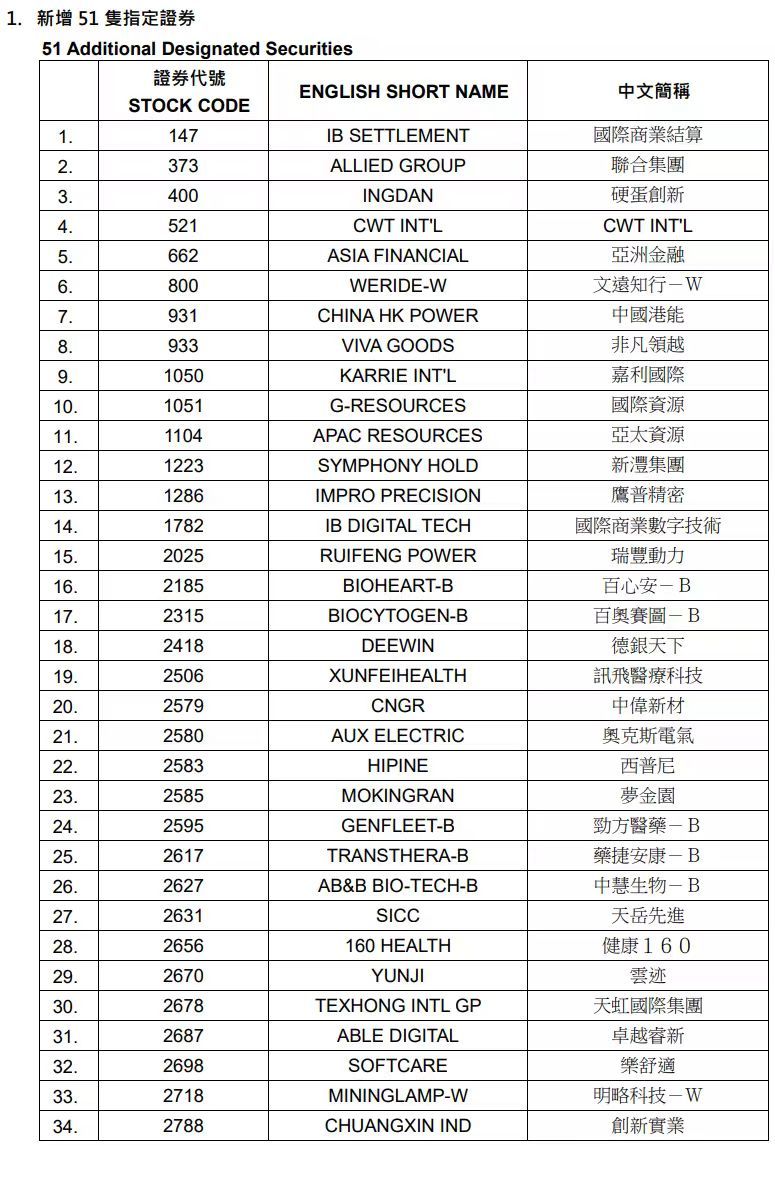 港交所更新认可沽空指定证券名单 - 香港交易所于2月10日发布公告,将对认可沽空指定证券名单进行调整,调整将于2026年2月13日起生效 [1] - 此次调整涉及新增51只指定证券,同时删除31只现行指定证券 [1] 新增认可沽空指定证券名单 - 新增名单涵盖多个行业,包括金融、科技、医疗健康、工业制造、资源及消费等 [2][3] - 金融类新增证券包括:亚洲金融(代号662)、国际资源(代号1051)、亚太资源(代号1104) [2] - 科技与创新类新增证券包括:硬蛋创新(代号400)、文远知行-W(代号800)、国际商业数字技术(代号1782)、讯飞医疗科技(代号2506)、云知声(代号9678) [1][2][3] - 医疗健康类新增证券包括:百心安-B(代号2185)、白奥赛图-B(代号2315)、劲方医药-B(代号2595)、乐捷安康-B(代号2617)、中慧生物-B(代号2627) [2] - 工业与制造类新增证券包括:鹰普精密(代号1286)、瑞丰动力(代号2025)、中信新材(代号2579)、三一重工(代号6031) [2][3] - 资源与材料类新增证券包括:德银天下(代号2418)、新疆新鑫矿业(代号3833)、佳鑫国际资源(代号3858) [2][3] - 消费及其他类新增证券包括:联合集团(代号373)、CWT INT‘L(代号521)、非凡领越(代号833)、嘉利国际(代号1050)、金界控股(代号3918)、宇华教育(代号6169)、赛力斯(代号9927) [1][2][3] 删除的现行认可沽空指定证券名单 - 删除名单同样涉及多个行业,部分公司来自房地产、汽车、医疗健康及科技领域 [4][5] - 房地产相关被删除证券包括:远东发展(代号35)、金地商置(代号535)、旭辉控股集团(代号884)、富力地产(代号2777)、金科服务(代号9666) [1][4][5] - 汽车相关被删除证券包括:浙江世宝(代号1057)、美东汽车(代号1268) [4][5] - 医疗健康类被删除证券包括:思派健康(代号314)、亿胜生物科技(代号1061)、科笛-B(代号2487)、君圣泰医学-B(代号2511)、中国抗体-B(代号3681)、昊海生物科技(代号6826)、海普瑞(代号9989) [1][4][5] - 科技与互联网类被删除证券包括:数字王国(代号547)、创梦天地(代号1119)、新火科技控股(代号1611)、Keep(代号3650)、东软睿新集团(代号9616) [4][5] - 其他被删除证券包括:凯成新能(代号1108)、Z FIN(代号1168)、中庆股份(代号1855)、傲基股份(代号2519)、广联科技控股(代号2531)、汇通达网络(代号9878)等 [4][5]