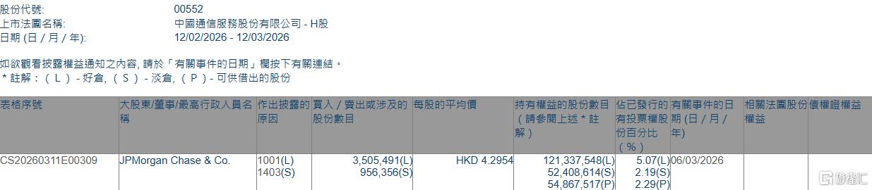 摩根大通增持中国通信服务股份 - 2026年3月6日,摩根大通以每股均价4.2954港元增持中国通信服务(00552.HK)好仓350.55万股,涉及资金约1505.75万港元 [1] - 增持后,摩根大通持有的好仓股份数目增至121,337,548股,持好仓比例由4.92%上升至5.07% [1] - 根据披露表格,截至2026年3月6日,摩根大通还持有52,408,614股淡仓(空头头寸),占比2.19%,以及54,867,517股可供借出的股份,占比2.29% [2] 公司股权变动详情 - 此次权益披露涉及的时间段为2026年2月12日至2026年3月12日 [2] - 披露的实体为摩根大通,其在公司的相关权益因本次增持好仓操作而发生变动 [2] - 公司上市法团名称为中国通信服务股份有限公司,股份代号为00552 [2]