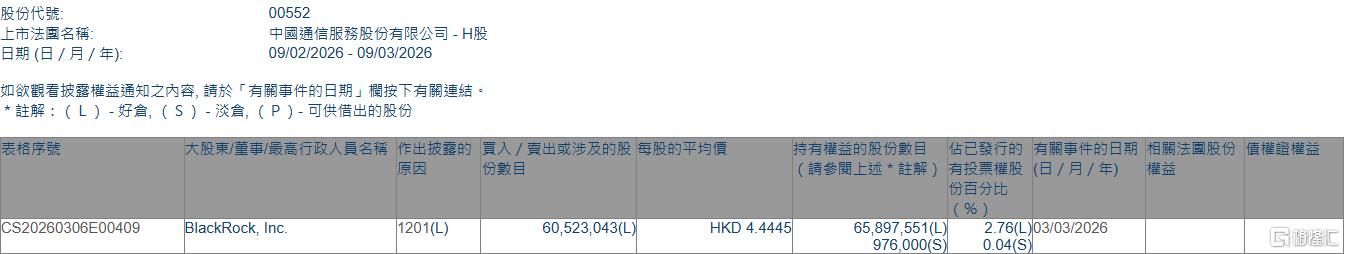 中国通信服务遭贝莱德减持约6052.30万股 每股作价约4.44港元