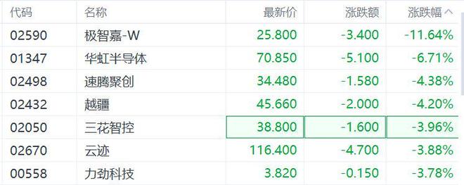 来源:格隆汇APP | 代码 | 名称 | 最新价 | 涨跌额 | 涨跌幅 ^ | | --- | --- | --- | --- | --- | | 02590 | 极智嘉-W | 25.800 | -3.400 | -11.64% | | 01347 | 华虹半导体 | 70.850 | -5.100 | -6.71% | | 02498 | 速腾聚创 | 34.480 | -1.580 | -4.38% | | 02432 | 誠讀 | 45.660 | -2.000 | -4.20% | | 02050 | 三花智控 | 38.800 | -1.600 | -3.96% | | 02670 | 云迹 | 116.400 | -4.700 | -3.88% | | 00558 | 力劲科技 | 3.820 | -0.150 | -3.78% | 格隆汇10月23日|港股机器人概念股集体下跌,极智嘉午后跌幅扩大至超11%,华虹半导体跌逾6%, 三花智控跌超3%,越疆、云迹等跟跌。 ...