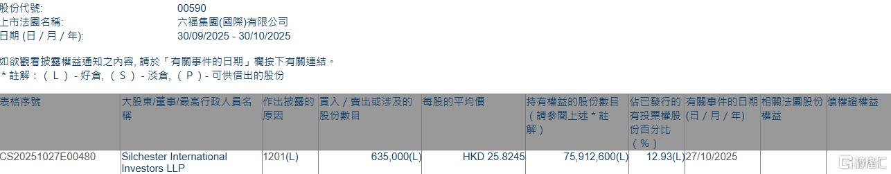 Silchester International Investors LLP减持六福集团63.5万股 每股作价约25.82港元