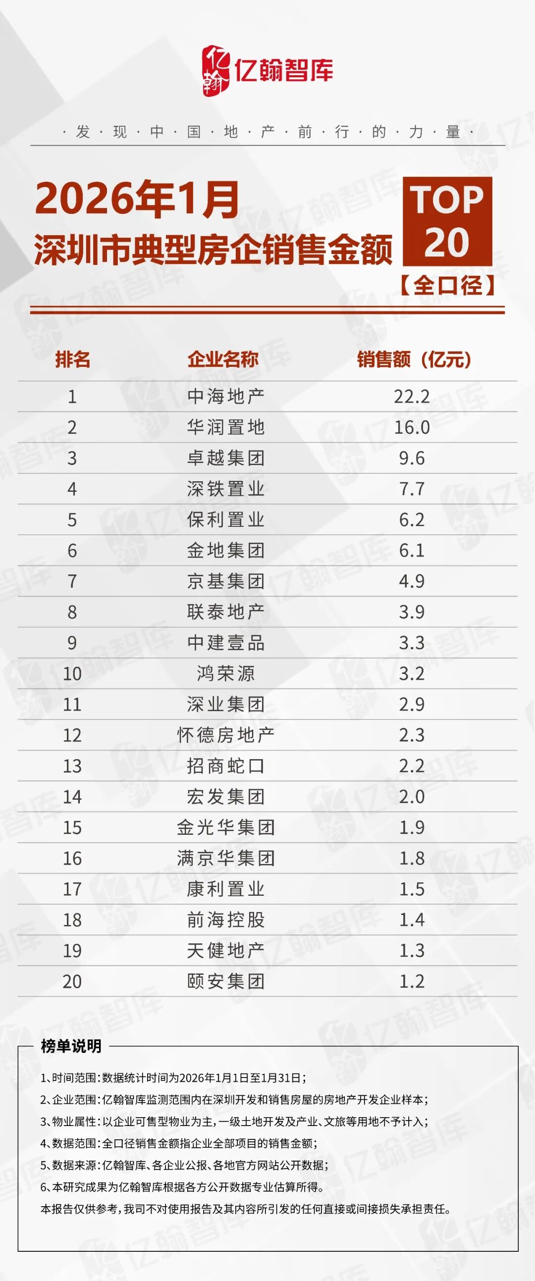 2026年1月深圳典型房企销售金额TOP20【全口径】
