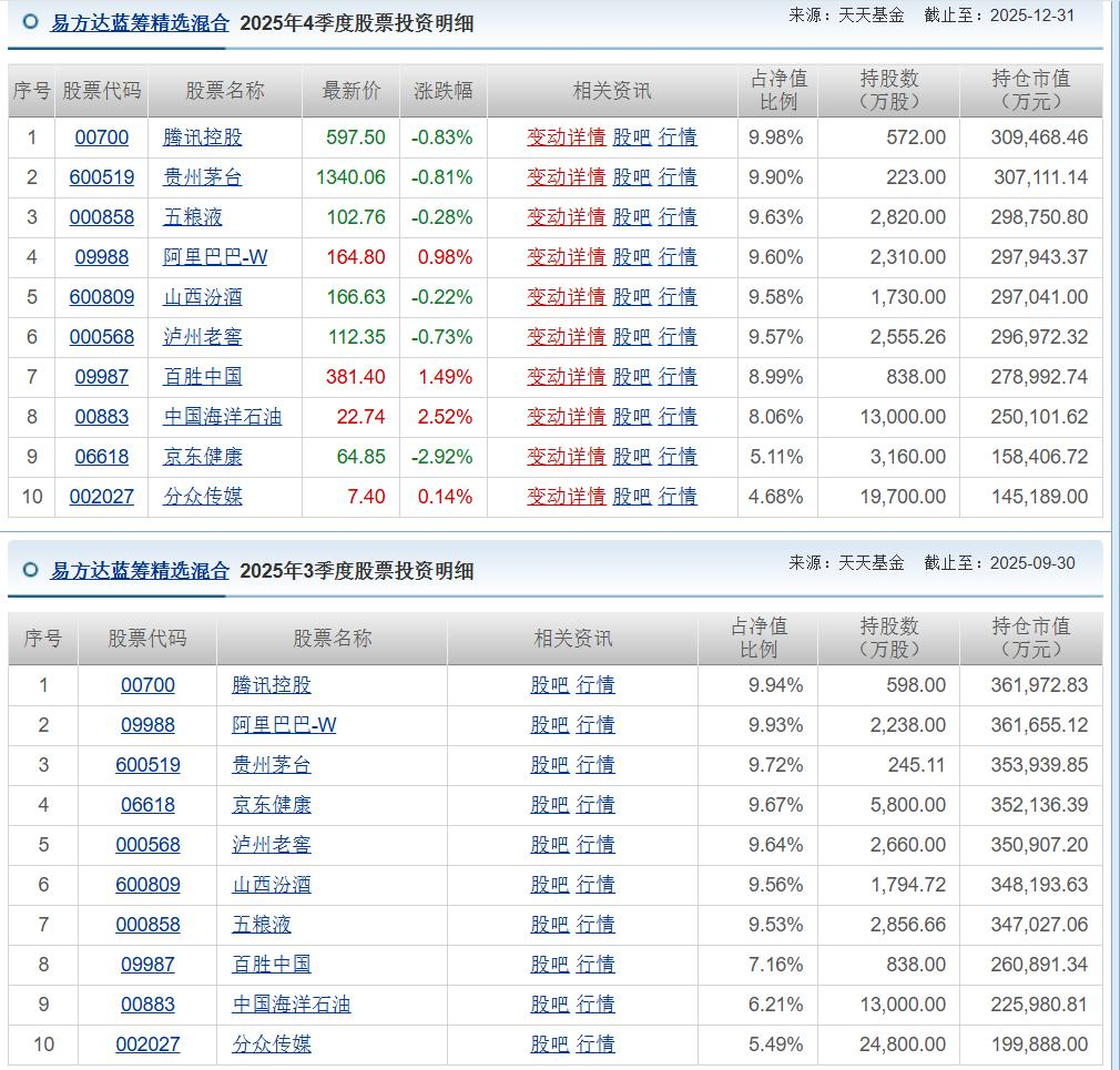 基金经理张坤2025年四季度操作与观点总结 基金业绩与规模 - 截至2025年12月末,张坤在管总规模为483.83亿元,已跌破500亿元 [1] - 旗下三只主投A股的产品季度收益告负且未能跑赢业绩比较基准,而主投海外中国股票的易方达亚洲精选逆势取得正收益并显著超越基准 [1] - 规模最大的产品易方达蓝筹精选,报告期份额净值增长率为 -8.93%,同期业绩比较基准收益率为-2.63% [1] 持仓调整与结构 - 易方达蓝筹精选、易方达优质精选、易方达优质企业三年持有基金均减持了贵州茅台、五粮液、泸州老窖、山西汾酒 [1] - 分众传媒、招商银行也遭明显减仓 [1] - 四季度保持了股票仓位稳定,但对结构进行了调整,重点调整了医药、消费和科技等行业的配置 [1] - 个股方面,仍然持有商业模式出色、行业格局清晰、竞争力强的优质公司 [1] - 易方达蓝筹精选前十大重仓股未发生变更,依次为:腾讯控股、贵州茅台、五粮液、阿里巴巴、山西汾酒、泸州老窖、百胜中国、中国海洋石油、京东健康、分众传媒 [2] - 较大幅度地减持了分众传媒,还减持了泸州老窖、山西汾酒、五粮液;加仓了阿里巴巴 [2] 前十大重仓股明细 - 腾讯控股(00700)占净值比例9.94%,持股598.00万股,持仓市值361,972.83万元 [3] - 阿里巴巴-W(09988)占净值比例9.93%,持股2,238.00万股,持仓市值361,655.12万元 [3] - 贵州茅台(600519)占净值比例9.72%,持股245.11万股,持仓市值353,939.85万元 [3] - 京东健康(06618)占净值比例9.67%,持股5,800.00万股,持仓市值352,136.39万元 [3] - 泸州老窖(000568)占净值比例9.64%,持股2,660.00万股,持仓市值350,907.20万元 [3] - 山西汾酒(600809)占净值比例9.56%,持股1,794.72万股,持仓市值348,193.63万元 [3] - 五粮液(000858)占净值比例9.53%,持股2,856.66万股,持仓市值347,027.06万元 [3] - 百胜中国(09987)占净值比例7.16%,持股838.00万股,持仓市值260,891.34万元 [3] - 中国海洋石油(00883)占净值比例6.21%,持股13,000.00万股,持仓市值225,980.81万元 [3] - 分众传媒(002027)占净值比例5.49%,持股24,800.00万股,持仓市值199,888.00万元 [3] 宏观经济与市场观点 - 对未来的宏观经济与市场表达了长期乐观的态度,认为未来十年老百姓的实际生活水平和社会保障水平会有显著提升,与发达国家的生活水平差距会明显缩小 [3] - 认为市场终会意识到投资国内公司也是“在有鱼的地方钓鱼” [3] - 以AI浪潮为例,阐述了中国市场的独特优势,认为强大的内需市场能虹吸全球资源、人才和资本为创新服务 [4] - 指出海外领先模型如GPT和Gemini的C端订阅费(每年约200美元)构成了企业重要收入来源,对模型企业融资和持续投入的信心起了重要作用 [4] - 提及投资的一家国内企业拥有国内领先的基础模型能力,认为如果有更强劲的消费环境,订阅收入和模型能力投入能实现更好互动,有助于未来追近全球领先水平 [4] 对投资组合的信心 - 回应市场对“护城河还在,城在不在”的担忧,表示始终对组合中企业的商业模式、竞争壁垒和现金流产生能力充满信心 [5] - 强调“城始终在那里”,认为以中国的禀赋走向发达国家不是意外,困难只是阶段性的 [5] - 指出市场先生的出价已使得一些优质公司即使私有化也非常划算,对长期投资者是很好的机会 [5]