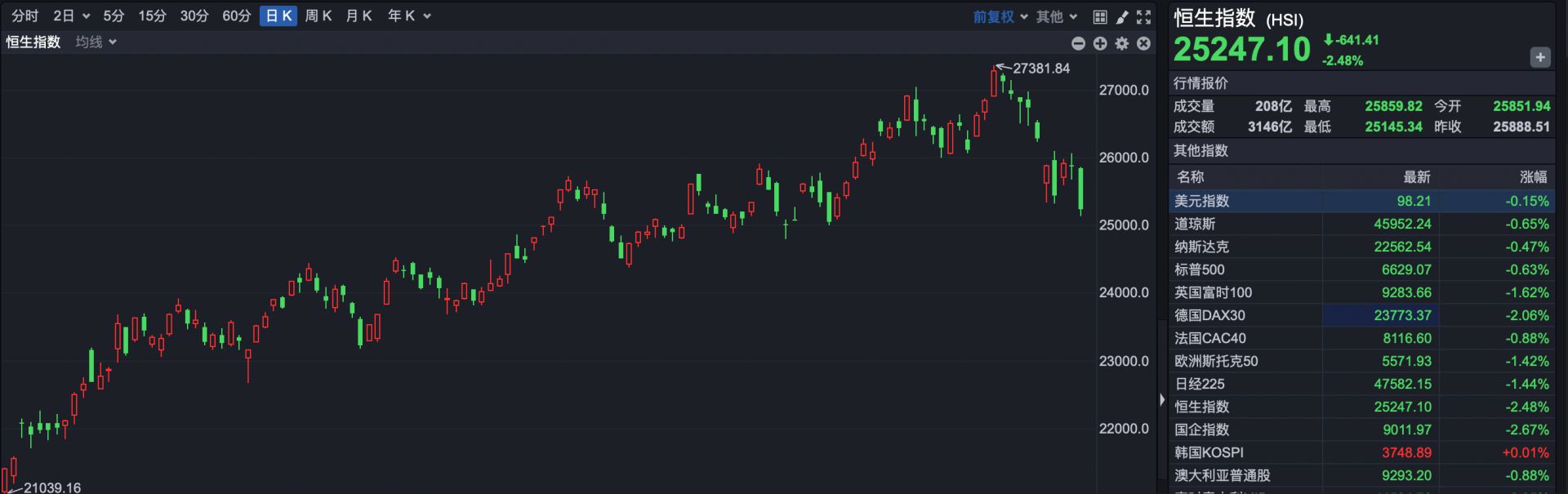 港股市场整体表现 - 恒生指数报收25247.10点,下跌641.41点,跌幅2.46%,创9月5日以来收盘新低 [1] - 恒生科技指数报收5760.38点,下跌243.18点,跌幅4.05%,自10月2日高点累计跌幅超14% [3] - 南向资金净买入港股金额超63亿港元 [9] 主要板块表现 - Wind香港二级行业指数全线回落,半导体、硬件设备、国防军工跌幅居前 [7] - 半导体板块跌幅达6.60%,硬件设备板块跌幅5.51%,国防军工板块跌幅5.18% [8] - 耐用消费品板块跌幅4.34%,日常消费零售板块跌幅4.33% [8] - 传媒板块跌幅4.10%,钢铁板块跌幅4.17%,建材板块跌幅3.81% [8] - 汽车与零配件板块跌幅3.55%,可选消费零售板块跌幅3.62% [8] - 石油石化板块跌幅1.59%,家电板块跌幅1.59%,房地产II板块跌幅1.49% [8] 焦点公司及个股表现 - 中兴通讯H股跌超12%,盘中最大跌幅达14%,其A股以跌停报收 [5] - 科网股全线下跌,百度、阿里巴巴、美团、快手跌超4%,小米、哔哩哔哩跌超3%,腾讯跌超1% [9] - 新消费概念股普跌,卫龙美味、布鲁可跌超6%,沪上阿姨跌超5%,奈雪的茶、泡泡玛特跌超4%,蜜雪集团、古茗跌超3% [8] - 苹果概念股下挫,丘钛科技跌超9% [9] - 光伏太阳能股延续跌势,阳光能源跌超5% [9]