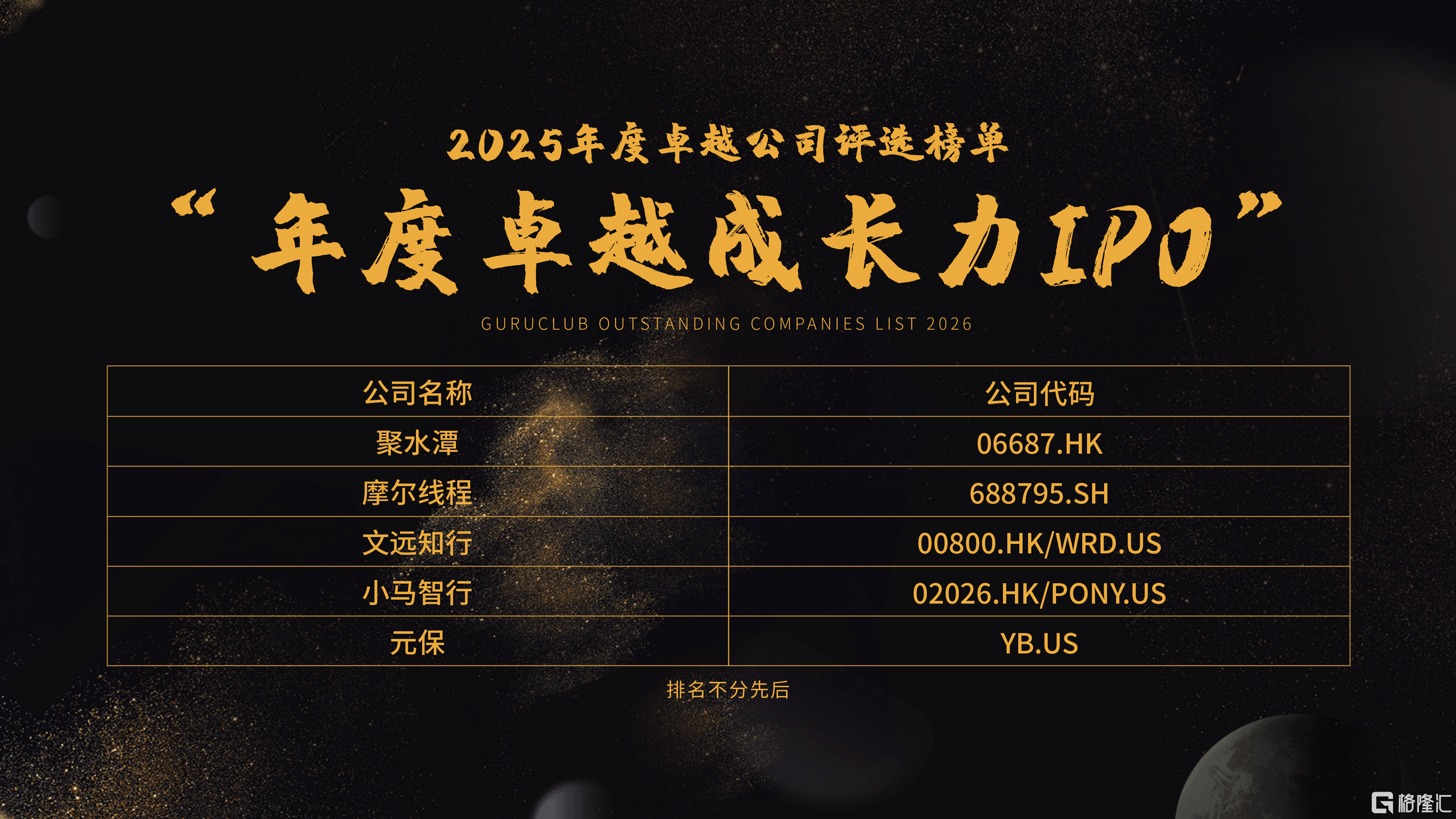 12月22日,格隆汇在线上举办"科技赋能·资本破局"分享会。本次分享会,备受瞩目的卓越公司评选榜 单将隆重揭晓,其中格隆汇"金格奖"年度卓越公司评选中,聚水潭(06687.HK)、摩尔线程(688795.SH)、 文远知行(00800.HK/WRD.US)、小马智行(02026.HK/PONY.US)、元保(YB.US) 5家企业荣获"年度卓越 成长力IPO"奖项。(排名不分先后,按公司首部字母顺序排列) | 2025年度卓越公司评选榜单 | | | --- | --- | | | 成长力IPO" | | 公司名称 | 公司代码 | | 聚水灌 | 06687.HK | | 摩尔线程 | 688795.SH | | 文远知行 | 00800.HK/WRD.US | | 小马智行 | 02026.HK/PONY.US | | 元保 | YB.US G BRIC | "年度卓越成长力IPO"奖项是对公司的融资规模、后市表现、盈利能力、财务安全、市值管理等指标进 行分析作出的综合评比结果。该奖项旨在发掘拥有持续获利并实现规模扩张的能力和潜力,同时为经济 的发展、社会的进步做出显著贡献的新上市公司。本次评选通过定量数 ...
