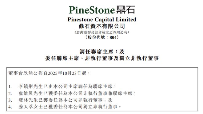 智通财经APP讯,鼎石资本(00804)发布公告,自2025年10月23日起:李镇彤先生已由公司主席调任为联 席主席;卢维兴先生已获委任为公司非执行董事兼联席主席;卢林先生已获委任为公司非执行董事;姜天萃 女士已获委任为公司独立非执行董事。 ...