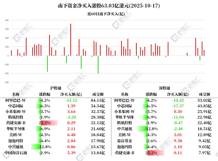 港股通资金流向 - 10月17日港股市场北水成交净买入63.03亿港元,其中港股通(沪)净买入56.56亿港元,港股通(深)净买入6.47亿港元 [1] - 北水净买入最多的个股是美团-W、盈富基金、中海油 [1] - 北水净卖出最多的个股是阿里巴巴-W、中芯国际、华虹半导体 [1] 个股买卖金额 - 阿里巴巴-W买卖总额84.11亿港元,净流出11.12亿港元 [2] - 中芯国际买卖总额54.54亿港元,净流入1.59亿港元 [2] - 小米集团-W买卖总额32.57亿港元,净流入3.64亿港元 [2] - 腾讯控股买卖总额28.38亿港元,净流出3.20亿港元 [2] - 药捷安康-B买卖总额22.12亿港元,净流入2881.05万港元 [2] - 华虹半导体买卖总额21.60亿港元,净流入2.11亿港元 [2] - 美团-W买卖总额18.04亿港元,净流入6.48亿港元 [2] 港股通(沪)活跃股 - 中兴通讯买卖总额18.51亿港元,净流出2.48亿港元 [4] - 美团-W买卖总额12.89亿港元,净流入5.01亿港元 [4] - 盈富基金买卖总额9.42亿港元,净流入9.38亿港元 [4] - 泡泡玛特买卖总额9.05亿港元,净流入1.10亿港元 [4] - 药捷安康-B买卖总额7.97亿港元,净流入1111.52万港元 [4] 个股表现及市场观点 - 美团-W获净买入11.49亿港元,公司升级餐饮商家"繁盛计划",推出四大举措并追加28亿元投入,包括20亿元助力金、3亿元支持店型模式创新、5亿元推动"明厨亮灶"新基建等 [6] - 盈富基金获净买入9.37亿港元,市场观点认为南下资金持续流入及美联储可预期的降息将改善港股市场流动性 [6] - 中海油获净买入5.39亿港元,机构预计10月布伦特原油价格偏弱运行于60-67美元/桶,但指出油价有底,石油企业业绩确定性高且具高分红特点 [6] - 小米集团-W获净买入4.14亿港元,公司股价波动受多宗新闻热点及市场传闻影响 [7] - 泡泡玛特获净买入3.94亿港元,"星星人"系列人气攀升,"Labubu"系列二手价格趋稳,第三季销售数据、圣诞主题新品及动画新作上映被视为短期催化剂 [7] - 华虹半导体和中芯国际分别遭净卖出8.92亿和15.78亿港元,背景是美国众议院"特别委员会"发布涉华半导体出口管制报告并提出九项建议以扩大出口限制 [7][8] - 阿里巴巴-W遭净卖出21.53亿港元,双11大促期间淘宝/天猫平台投放30亿元定金直播红包,机构预测其FY26Q2中国电商业务收入为1269亿元(同比增长11.6%),EBITA Margin为6.8% [8] - 药捷安康-B获净买入3992万港元,腾讯和中兴通讯分别遭净卖出3.66亿和1.61亿港元 [8]