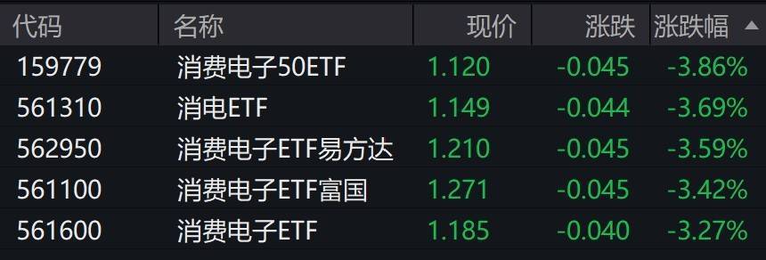 消费电子概念股走低,亿纬锂能跌超7%,立讯精密跌超4%,中芯国际、澜起科技、歌尔股份跌超3%。 每日经济新闻 | 代码 | 名称 | 现价 | | 涨跌 涨跌幅 ▲ | | --- | --- | --- | --- | --- | | 159779 | 消费电子50ETF | 1.120 | -0.045 | -3.86% | | 561310 | 消电ETF | 1.149 | -0.044 | -3.69% | | 562950 | 消费电子ETF易方达 | 1.210 | -0.045 | -3.59% | | 561100 | 消费电子ETF富国 | 1.271 | -0.045 | -3.42% | | 561600 | 消费电子ETF | 1.185 | -0.040 | -3.27% | 中证消费电子主题指数选取50只业务涉及元器件生产、整机品牌设计及生产等消费电子相关的上市公司证券作为指数样 本,以反映消费电子主题上市公司证券的整体表现。 有机构分析表示,消费电子板块中长期成长逻辑依然稳固,AI创新产业趋势明确,看好板块修复机会。国内供应链具备强 研发能力、强工程师红利、基本面稳固的消费电子 ...