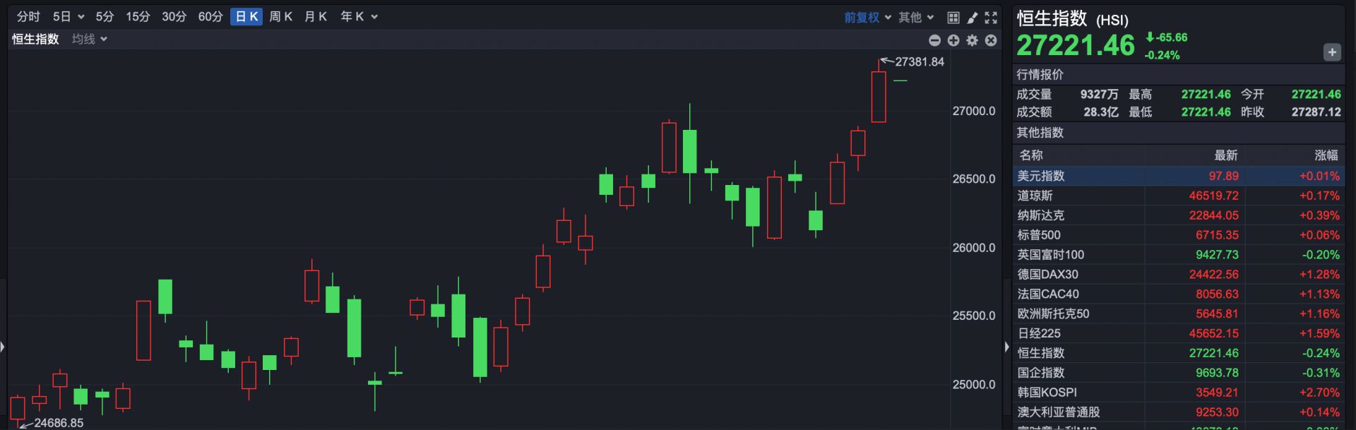 港股市场整体表现 - 港股市场在连续三个交易日上涨后出现回调,恒生指数收盘下跌0.54%至27140.92点 [1] - 市场成交额显著萎缩至1347.8亿港元 [1] - 恒生指数年初至今累计上涨35.30% [2] 主要指数表现 - 恒生科技指数表现弱于大盘,收盘下跌0.90%至6622.85点 [1][2] - 恒生国企指数收盘下跌0.68%至9658.34点 [1][2] - 恒生科技指数年初至今累计上涨48.22%,恒生国企指数年初至今累计上涨32.49% [2] 恒生指数成份股表现 - 中信股份、华润万象生活、龙湖集团、金沙中国、万洲国际等成份股跌幅均超过2% [1] 恒生科技指数成份股表现 - 比亚迪股份和快手跌幅超过3% [1] - 小鹏汽车、理想汽车、蔚来等新能源汽车股跌幅超过2% [1] - 携程集团、京东、金山软件、比亚迪电子、网易、同程旅行、腾讯音乐跌幅超过1% [1] 逆势上涨个股 - 阿里巴巴和中芯国际股价逆势创下新高 [1]