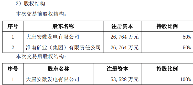 10月28日,大唐发电发布公告,2025年9月,全资子公司大唐安徽发电有限公司("大唐安徽公司")与淮南 矿业(集团)有限责任公司("淮南矿业")签订了《产权交易合同》,大唐安徽公司以交易价格1元购买淮 南矿业持有的安徽电力股份有限公司("安徽电力股份")50%股权。 安徽电力股份作为淮南市唯一市政供热和工业供热企业,承担区域重要能源保供责任,居民供热覆盖面积约 35万平方米,为民生用热保障提供关键支撑。公司本次收购股权旨在更好履行社会责任和民生保供责任,最 大限度保护股东及相关方利益。交易完成后,大唐安徽公司将持有安徽电力股份100%股权,安徽电力股份 将间接成为公司全资子公司,并纳入公司的合并报表范围。本次交易预计影响公司合并口径归母净利润减少 约5.89亿元(未经审计),最终以公司在定期报告中披露数据为准。 后续,安徽电力股份将依托上市公司在技术、管理等方面的专业优势,通过一系列精准化提质增效举措,进 一步提升管理效能,有效培育自主经营与可持续发展能力,加速摆脱经营困境,为全体股东持续创造价值。 | 序号 | 股东名称 | 注册资本 | 持股比例 | | | --- | --- | --- | ---  ...