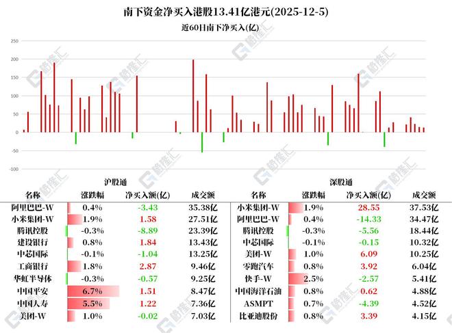 南下资金单日流向 - 2023年12月5日,南下资金净买入港股13.41亿港元 [1] - 单日净买入额最高的公司为小米集团-W,达30.13亿港元 [1] - 单日净卖出额最高的公司为阿里巴巴-W,达17.76亿港元 [1] 重点公司资金流向详情 - 净买入方面:除小米集团-W外,主要买入对象包括盈富基金(26.06亿港元)、美团-W(6.07亿港元)、零跑汽车(3.92亿港元)、比亚迪股份(3.39亿港元)以及工商银行(2.86亿港元)等 [1] - 净卖出方面:除阿里巴巴-W外,主要卖出对象包括腾讯控股(14.45亿港元)、ASMPT(4.39亿港元)、快手-W(2.56亿港元)以及中芯国际(1.18亿港元) [1] 近期资金连续流向趋势 - 南下资金已连续7日净买入美团-W,累计金额达28.9598亿港元 [1] - 南下资金已连续6日净买入小米集团-W,累计金额达50.656亿港元 [1] - 南下资金已连续12日净卖出中芯国际,累计金额达35.6848亿港元 [1] - 南下资金已连续4日净卖出腾讯控股,累计金额达39.0479亿港元 [1] 相关股票市场表现与成交额 - 小米集团-W股价上涨1.9%,成交额达37.53亿港元,获净买入28.55亿港元 [3] - 阿里巴巴-W股价上涨0.4%,成交额达34.47亿港元,遭净卖出14.33亿港元 [3] - 腾讯控股股价下跌0.3%,成交额达18.44亿港元,遭净卖出5.56亿港元 [3] - 美团-W股价上涨1.0%,成交额达10.25亿港元,获净买入6.09亿港元 [3] - 零跑汽车股价上涨0.8%,成交额达6.04亿港元,获净买入3.92亿港元 [3] - 快手-W股价上涨2.5%,成交额达5.41亿港元,遭净卖出2.57亿港元 [3] - 比亚迪股份股价上涨0.8%,成交额达4.15亿港元,获净买入3.39亿港元 [3] - ASMPT股价上涨0.7%,成交额达4.52亿港元,遭净卖出4.39亿港元 [3]