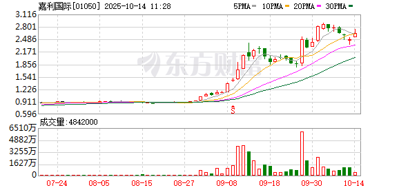 公司股价表现 - 嘉利国际(01050 HK)股价在10月14日盘中一度上涨超过10% [2] - 截至发稿时,公司股价涨幅为5.24%,报收于2.61港元 [2] - 当日成交金额为1071.49万港元 [2]