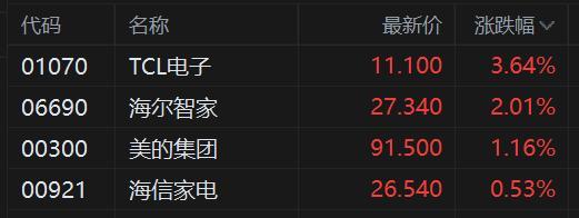 港股异动丨家电股普涨 TCL电子涨近3% 美的集团创阶段新高