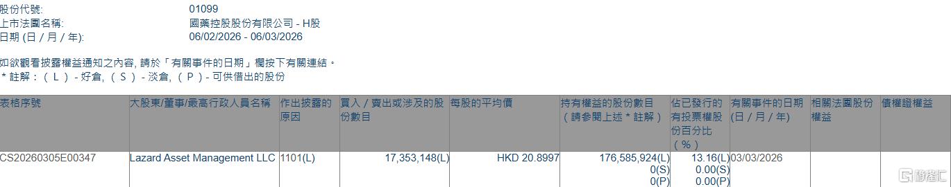 核心事件 - Lazard Asset Management LLC 于2026年3月3日增持国药控股股份,以每股均价20.8997港元买入1735.31万股,涉资约3.63亿港元 [1] - 此次增持后,Lazard Asset Management LLC 的持股数目增至176,585,924股,持股比例由11.87%上升至13.16% [1] 股东权益变动详情 - 披露主体为Lazard Asset Management LLC,其身份为“大股東/董事/最高行政人員名稱” [2] - 交易涉及股份数量为17,353,148股,与新闻中1735.31万股数据一致 [2] - 交易完成后,其持有的有投票权股份占比为13.16% [2]