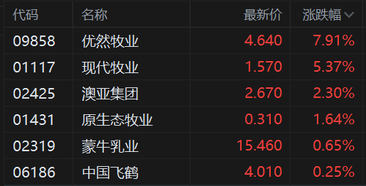 乳制品股拉升 优然牧业涨近8% 中国飞鹤跟涨