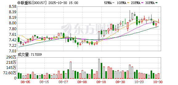 机构持仓方面,截止2025年9月30日,中联重科十大流通股东中,中国证券金融股份有限公司位居第六 大流通股东,持股2.33亿股,持股数量较上期不变。香港中央结算有限公司位居第七大流通股东,持股 2.02亿股,相比上期增加1973.44万股。华泰柏瑞沪深300ETF(510300)位居第十大流通股东,持股 8447.99万股,相比上期减少432.63万股。 中联重科所属申万行业为:机械设备-工程机械-工程机械整机。所属概念板块包括:工程机械、雅下电 站概念、氢能源、固废处理、一带一路等。 截至9月30日,中联重科股东户数23.64万,较上期减少9.85%;人均流通股0股,较上期增加0.00%。 2025年1月-9月,中联重科实现营业收入371.56亿元,同比增长8.06%;归母净利润39.20亿元,同比增长 24.89%。 分红方面,中联重科A股上市后累计派现288.80亿元。近三年,累计派现80.13亿元。 10月31日,中联重科盘中上涨2.24%,截至09:48,报8.21元/股,成交2.74亿元,换手率0.48%,总市值 710.04亿元。 资金流向方面,主力资金净流入3798.18万元,特大单买入583 ...