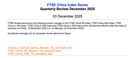 来源:证券时报 又有重要指数成份股调整。 12月3日,富时罗素宣布对富时中国50指数、富时中国A50指数、富时中国A150指数、富时中国A200指 数、富时中国A400指数的审核变更。该变更将于2025年12月19日星期五收盘后生效。 据了解,富时罗素在选股的时候,一般都是根据专业分析、实地考察以及过往的盈利能力作为准则,因 此被富时罗素"青睐"的公司在过去的一年经营情况在A股范围内也是个中翘楚。 纳入这些股票 具体来看,富时中国A50指数纳入洛阳钼业、阳光电源;删除江苏银行、顺丰控股。 | 纳入个股 | | 剔除个股 | | | --- | --- | --- | --- | | 证券代码 | 证券简称 | 证券代码 | 证券简称 | | 603993. SH | 洛阳钥业 | 600919. SH | 江苏银行 | | 300274. SZ | 阳光电源 | 002352. SZ | 顺丰控股 | 富时中国A50指数由富时罗素编制并发布。该指数由上海和深圳证券交易所市场中总市值最大的50只股 票组成,反映A股市场中最具影响力的前50大上市公司股票的表现,不少国际投资者把这一指数看作是 衡量中国市场的精确指 ...