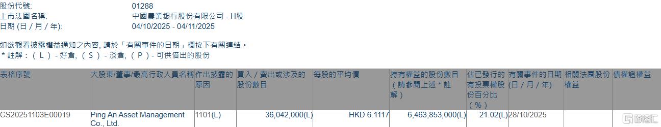 | 200 - 100 - | 大股東/董事/最高行政人員名稱作出披露的 買入 / 費出或涉及的 每股的平均價 | | 持有權益的股份數目 佔已發行的 有關事件的日期 | | | --- | --- | --- | --- | --- | | | 版 元 第二 | | (語参留上流*註 | 有投票權股 (日 / 月 / 年) | | | | | | 份自分比 | | CS20251103E00019 | Ping An Asset Management 1101(L) 36,042,000(L) | HKD 6.1117 | 6,463,853,000(L) | 21.02(L)28/10/2025 | | | Co., Ltd. | | | | | 股份代號: | 01288 | | --- | --- | | 上市法國名稱: | 中國農業銀行股份有限公司 - H | | 日期 (日 / 月 / 年): | 04/10/2025 - 04/11/2025 | 格隆汇11月4日丨根据联交所最新权益披露资料显示,2025年10月28日,农业银行(01288.HK)获Ping An Asset Managemen ...