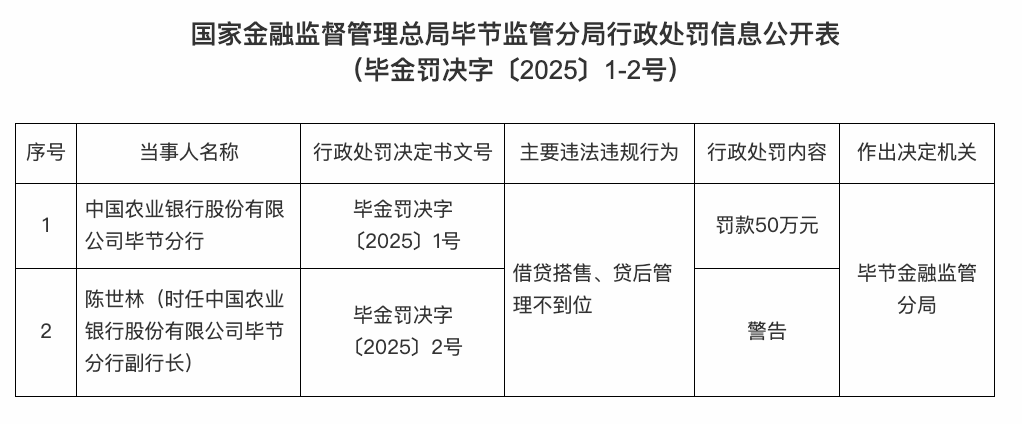 凤凰网财经讯 10月31日,据国家金融监督管理总局官网消息显示,农业银行毕节分行因借贷搭售、贷后管理不到位被罚款50万元,时任农行毕节 分行副行长陈世林被处以警告。 截图:国家金融监督管理总局官网 | 序号 | 当事人名称 | 行政处罚决定书文号 | 主要违法违规行为 | 行政处罚内容 | 作出决定机关 | | --- | --- | --- | --- | --- | --- | | | 中国农业银行股份有限 公司毕节分行 | 毕金罚决字 〔2025〕 1号 | 借贷搭售、贷后管 | 罚款50万元 | 毕节金融监管 | | 2 | 陈世林(时任中国农业 银行股份有限公司毕节 | 毕金罚决字 | 理不到位 | 警告 | 分局 | | | 分行副行长) | 〔2025〕 2号 | | | | ...