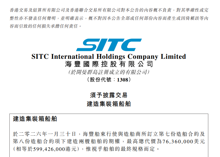 格隆汇1月30日丨海丰国际(01308.HK)公布,于2026年1月30日,海丰船东行使与造船商所订立第七份造 船合约及第八份造船合约项下建造两艘船舶的期权,最高总代价为7636万美元,惟视乎船舶的最终规格 而定。 ...