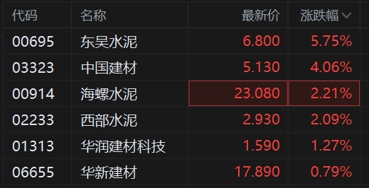 港股建材水泥股震荡走高,东吴水泥(00695.HK)涨超6%,中国建材(03323.HK)、海螺水泥(00914.HK)、华润建材水泥(01313.HK...
