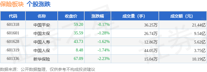 | 代码 | 名称 | 主力净流入 (元) | 主力净占比 游资净流入 (元) | | 游资净占比 散户净流入 (元) | | 散户净占比 | | --- | --- | --- | --- | --- | --- | --- | --- | | 601336 新华保险 | | 2557.31万 | 2.51% | 5064.66万 | 4.97% | -7621.97万 | -7.48% | | 601628 中国人寿 | | -52.93万 | -0.09% | 3344.07万 | 5.95% | -3291.14万 | -5.85% | | 601601 中国太保 | | -876.93万 | -0.92% | 4536.69万 | 4.75% | -3659.75万 | -3.84% | | 601319 中国人保 | | -1797.51万 | -4.79% | 2627.01万 | 7.00% | -829.50万 | -2.21% | | 601318 中国平安 | | -3043.32万 | -1.42% | -3954.39万 | -1.84% | 6997.72万 | 3.26% | 从 ...
