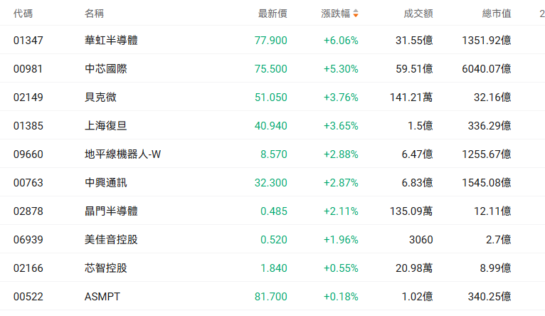 消息面上,SK海力士当地时间11月5日表示,已与英伟达就明年第六代高带宽存储器(HBM4)的供应完成了价 格和数量谈判。此次HBM4的供应价格将比上一代产品高出50%以上,这款HBM4将搭载于英伟达明年下半 年发布的下一代人工智能芯片Rubin。作为全球HBM市场的龙头,SK海力士的此次定价落地或将引爆市场对 高端存储芯片的价值重估。 11月6日,芯片股涨幅居前,截至发稿,华虹半导体涨超6%,中芯国际涨超5%,贝克微、上海复旦涨近 4%,中兴通讯涨近3%。 | 代碼 | 名稱 | 最新價 | 漲跌幅 ◆ | 成交額 | 總市值 2 | | --- | --- | --- | --- | --- | --- | | 01347 | 華虹半導體 | 77.900 | +6.06% | 31.55億 | 1351.92億 | | 00981 | 中芯國際 | 75.500 | +5.30% | 59.51億 | 6040.07億 | | 02149 | 貝克微 | 51.050 | +3.76% | 141.21萬 | 32.16億 | | 01385 | 上海復旦 | 40.940 | +3.65% | 1.5億 ...