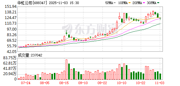 进一步统计,近3个月内该股累计发生6笔大宗交易,合计成交金额为8627.61万元。 证券时报·数据宝统计显示,华虹公司今日收盘价为122.75元,下跌1.84%,日换手率为5.81%,成交额 为28.83亿元,全天主力资金净流出2.76亿元,近5日该股累计下跌8.05%,近5日资金合计净流出7.28亿 元。 华虹公司11月3日大宗交易平台出现一笔成交,成交量2.10万股,成交金额262.61万元,大宗交易成交价 为125.05元,相对今日收盘价溢价1.87%。该笔交易的买方营业部为东北证券股份有限公司杭州教工路 证券营业部,卖方营业部为财通证券股份有限公司杭州新北街证券营业部。 两融数据显示,该股最新融资余额为20.56亿元,近5日增加3.02亿元,增幅为17.24%。(数据宝) 11月3日华虹公司大宗交易一览 | 成交量 | 成交金额 | 成交价 | 相对当日收盘 | | | | --- | --- | --- | --- | --- | --- | | (万 | (万元) | 格 | 折溢价(%) | 买方营业部 | 卖方营业部 | | 股) | | (元) | | | | | 2.10 | 262.61 ...