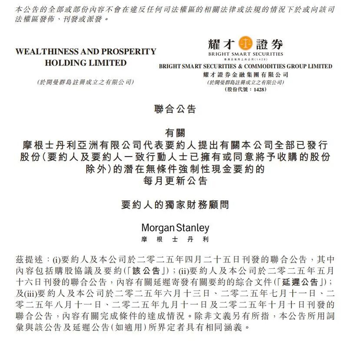 强制要约 - 2025年11月13日可能强制全面要约[1] 衍生工具交易 - 2025年11月12日摩根士丹利国际有限公司进行衍生工具交易[2] - 交易为客户主动利便客户买入,产品为其他类别[2] - 涉及衍生工具参照证券数目104,000[2] - 衍生工具到期日2027年11月8日[2] - 交易参考价$8.3540,总金额$868,819.9936[2] - 交易后数额为0[2] 公司关系 - 摩根士丹利国际有限公司是与要约人有关连的第(5)类联系人[2] - 摩根士丹利国际有限公司最终由摩根士丹利拥有[3]