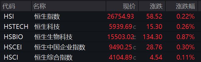 市场指数表现 - 香港恒生指数开盘报26754.93点,上涨58.52点,涨幅0.22% [1][2] - 恒生科技指数报5939.69点,上涨15.30点,涨幅0.26% [1][2][3] - 恒生生物科技指数报15503.02点,上涨134.30点,涨幅0.87% [2] - 恒生中国企业指数报9490.25点,上涨28.76点,涨幅0.30% [2] - 恒生综合指数报4104.89点,上涨4.54点,涨幅0.11% [2] 行业板块涨跌 - 白酒、家电、软件服务、房地产等板块涨幅居前 [1] - 半导体、传媒等板块出现下跌 [1] 重点公司股价变动 - 小鹏汽车-W股价上涨2.12%,报110.800港元 [2][3] - 蔚来股价下跌超过4% [2] - 阿里巴巴股价下跌超过2% [2] - 耀才证券金融股价下跌4% [2] - 京东健康股价上涨1.71%,报62.500港元 [3] - 携程集团-S股价上涨1.41%,报575.500港元 [3] - 网易-S股价上涨1.36%,报223.000港元 [3] - 联想集团股价上涨1.11%,报10.970港元 [3] - 海尔智家股价上涨1.00%,报26.200港元 [3] - 小米集团-W股价上涨0.98%,报43.400港元 [3] 公司事件 - 蚂蚁集团考虑延期收购交易耀才证券金融 [2]