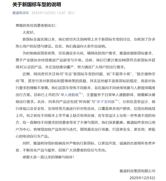 公司声明核心观点 - 雅迪控股官方于12月5日发布说明,旨在回应近期关于其新国标车型“毛豆”的公众讨论和用户反馈 [1][6] - 公司承认在产品版本上市节奏衔接和部分车型设计上存在考虑不周之处,并向消费者致歉 [2][7] - 公司强调将坚持以用户为中心,加快产品布局与迭代,并持续积极响应和执行新国标 [2][7] 产品与研发进展 - 为响应国家新国标政策并满足多元化用户需求,雅迪携手产业链伙伴持续推进产品研发与升级 [1][6] - 公司目前已累计推出**68款**符合新国标且获得3C认证的产品,并正在加快推动这些产品的量产 [1][6] - 针对引发讨论的“毛豆”车型,公司解释其规划了不同版本以覆盖不同使用场景与人群,包括已上市的“单人通勤版”、以及后续将陆续上市的“时尚版”与“亲子宝妈版” [2][7] 市场反馈与公司回应 - 近期网络关注焦点集中在“毛豆”车型的“不能带小孩”、“缺乏储物空间”等问题,甚至引发了对新国标政策本身的质疑 [2][7] - 公司澄清,上述具体问题并非新国标的规定,而是公众对政策执行要求存在理解不准确 [2][7] - 公司表示将以更加开放、诚恳的态度倾听各界声音,不断优化产品与服务 [2][7]