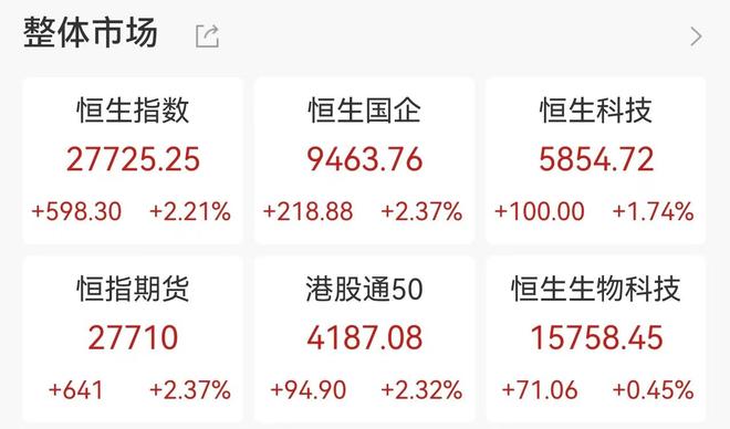 港股午评:恒指涨2.21%,恒生技指涨1.74%,金融、科技、中字头等权重集体拉升, 鸣鸣很忙首日涨超70%