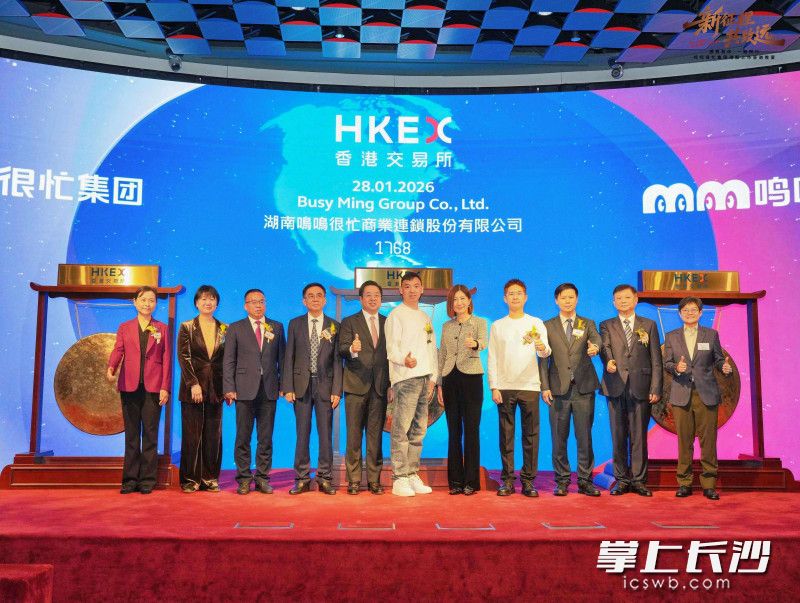 长沙晚报掌上长沙1月28日讯(全媒体记者 曹开阳)1月28日,中国最大的休闲食品饮料连锁零售商——湖南鸣鸣 很忙商业连锁股份有限公司(以下简称"鸣鸣很忙")正式在香港联合交易所主板挂牌上市,证券简称为"鸣鸣很 忙",股份代号为1768.HK,开盘较发行价236.6港元/股大涨超88%,对应总市值超952亿港元。 鸣鸣很忙是继红星冷链于1月13日在港上市后,今年上市的第二家长沙企业。至此,长沙境内外上市公司增至96 家。1月22日,"长沙企业上市香港之家"授牌成立,以进一步助力本地企业对接香港资本市场,搭建更高效的上市 服务桥梁。据了解,麦济生物、军信股份、可孚医疗、安克创新、西子健康等企业均已提交港股上市申请。 这一模式构成了"消费者得实惠、产业端有发展"的良性循环。 深耕国内大市场,服务实体经济 鸣鸣很忙的快速发展,建立在中国统一大市场建设、物流体系完善和数字化能力提升的坚实基础之上。通过全国 化的仓储物流网络和标准化管理体系,实现了对万店规模的稳定运营和高质量发展。 鸣鸣很忙旗下拥有"零食很忙""赵一鸣零食"两大品牌,是中国食品饮料量贩模式的引领者。2025年前9个月,鸣鸣 很忙实现零售额661亿元人民币 ...