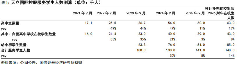 文章核心观点 - 天立国际控股通过积极扩招转校生和加速AI教育业务商业化,应对短期招生增速下滑,公司预计2026财年学生人数和服务收入将实现增长,同时公司宣布股份回购计划以增强市场信心 [1][2][8] 民办学历学校业务 - 公司战略性扩招转校生以补充生源,截至2026年1月25日已完成转校生招生3603人,预计全年有望达成7000人 [2][3] - 在转校生补充下,预计2026财年公司全年服务学生人数有望达14.8万人,同比增长约14%,其中服务高中生人数有望达6.3万人,同比增长17% [3] - 2025年秋季学期初服务学生人数同比增长约8%,增速边际放缓,主要因公司自身阶段性战略如提高生源门槛所致,并非人口宏观趋势影响 [4] - 公司长期招生策略调整包括:适度放宽招生门槛、优化内部学段衔接以提升集团内学校直升比例(2026年部分校区已达60%以上,2025年约为50%)、组建专职招生队伍 [5] AI+教育业务 - AI冲刺营业务加速落地,截至2026年1月26日覆盖学生已达1934人,全年有望突破4000人,预计2026财年该业务有望实现收入0.88亿元 [2][5] - AI冲刺营教学效果持续验证:2024年试点36名学生中有31人提分,平均提分36分;2025年对近1000名学生的试点显示平均提分48分,并有学生获清华、北大录取 [7] - 公司AI冲刺营目前仅覆盖其服务学生人数的1.3%,中期在集团校内覆盖率有望提升至10%,并已开始向外部学校复制,2026年1月新签约两所外部学校 [7] - 预计公司2026-2028财年AI冲刺营业务分别有望实现收入0.88亿元、1.54亿元、2.31亿元 [2][7] 财务预测与估值 - 预测公司FY2026-FY2028收入为39.15亿元、42.25亿元、44.99亿元,对应增速为9.1%、7.9%、6.5% [2][8] - 预测FY2026-FY2028经调整净利润至7.41亿元、8.21亿元、9.01亿元,对应增速为11.5%、10.9%、9.7% [2][8] - 最新收盘市值对应FY2026预测市盈率(PE)为7倍,估值因短期招生增速下滑已回落至高性价比区间 [2][8] 公司行动与股东信心 - 公司于2026年1月28日发布意向回购公告,计划动用最高2亿港元在公开市场购回股份,每股购回价不高于紧接每次购回前五个交易日平均收市价的5% [1][8] - 公司持续回购及董事长持续增持,有望增强投资者信心 [2][8]