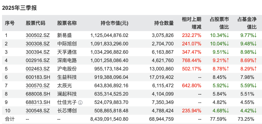 多位知名基金经理三季度调仓路径曝光 随着A股上市公司三季报、主动权益基金三季报密集披露,多位知名基金经理的调仓动向浮出水面。 例如,三季度,傅鹏博管理的睿远成长价值、谢治宇管理的兴全合润均加仓了PCB龙头东山精密;而莫海波管理的万家臻选减 仓光模块,加仓了机器人产业链;郑巍山管理的银河创新成长新进重仓了晶圆制造龙头华虹公司、翱捷科技-U等个股。泉果基 金赵诣、平安基金周思聪则分别加仓了港股科技和港股医药。 值得一提的是,一些重仓AI算力板块的主动权益基金,三季度的收益颇丰,也吸引了大量净申购资金。因此,有基金经理提示 投资者,当前应理性对待赛道型基金产品。 永赢科技智选(年内回报率暂居主动权益基金首位)基金经理任桀在三季报中提到,云计算行业长期具备较大的成长空间,近 几个季度也已有不错的表现,但不要用过去的业绩去预测未来,任何风险资产都不是只涨不跌的,要当心估值扩张周期后的均 值回归。 瞄准科技牛股 今年三季度,PCB龙头股成为部分基金经理的"心头好"。 东山精密2025年三季报显示,截至今年三季度末,其前十大流通股股东名单中,出现了睿远基金傅鹏博、兴全基金谢治宇、摩 根资管杜猛的身影。 其中,傅鹏博管理的睿 ...