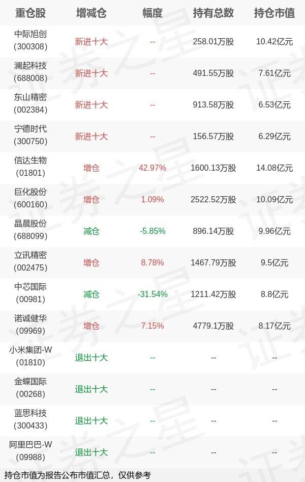 证券之星消息,10月27日兴证全球基金旗下谢治宇 薛怡然管理的兴全合宜灵活配置混合型基金(LOF)公布三季报,近1年净值增长率43.58%。与上 一季度相比,该基金前十大重仓股新增中际旭创,澜起科技,东山精密,宁德时代;并对信达生物增仓480.95万股,为该基金第一大重仓股;小 米集团-W,金蝶国际,蓝思科技,阿里巴巴-W等退出前十大重仓股;详细数据如下: | 重仓股 | 增减仓 | 幅度 | 持有总数 | 持仓市值 | | --- | --- | --- | --- | --- | | 中际旭创 (300308) | 新进十大 | | 258.01万股 | 10.42亿元 | | 澜起科技 (688008) | 新进十大 | 77 | 491.55万股 | 7.61亿元 | | 东山精密 (002384) | 新进十大 | | 913.58万股 | 6.53亿元 | | 宁德时代 (300750) | 新进十大 | | 156.57万股 | 6.29亿元 | | 信达生物 (01801) | 增仓 | 42.97% | 1600.13万股 | 14.08亿元 | | 巨化股份 (600160) | 增仓 | ...