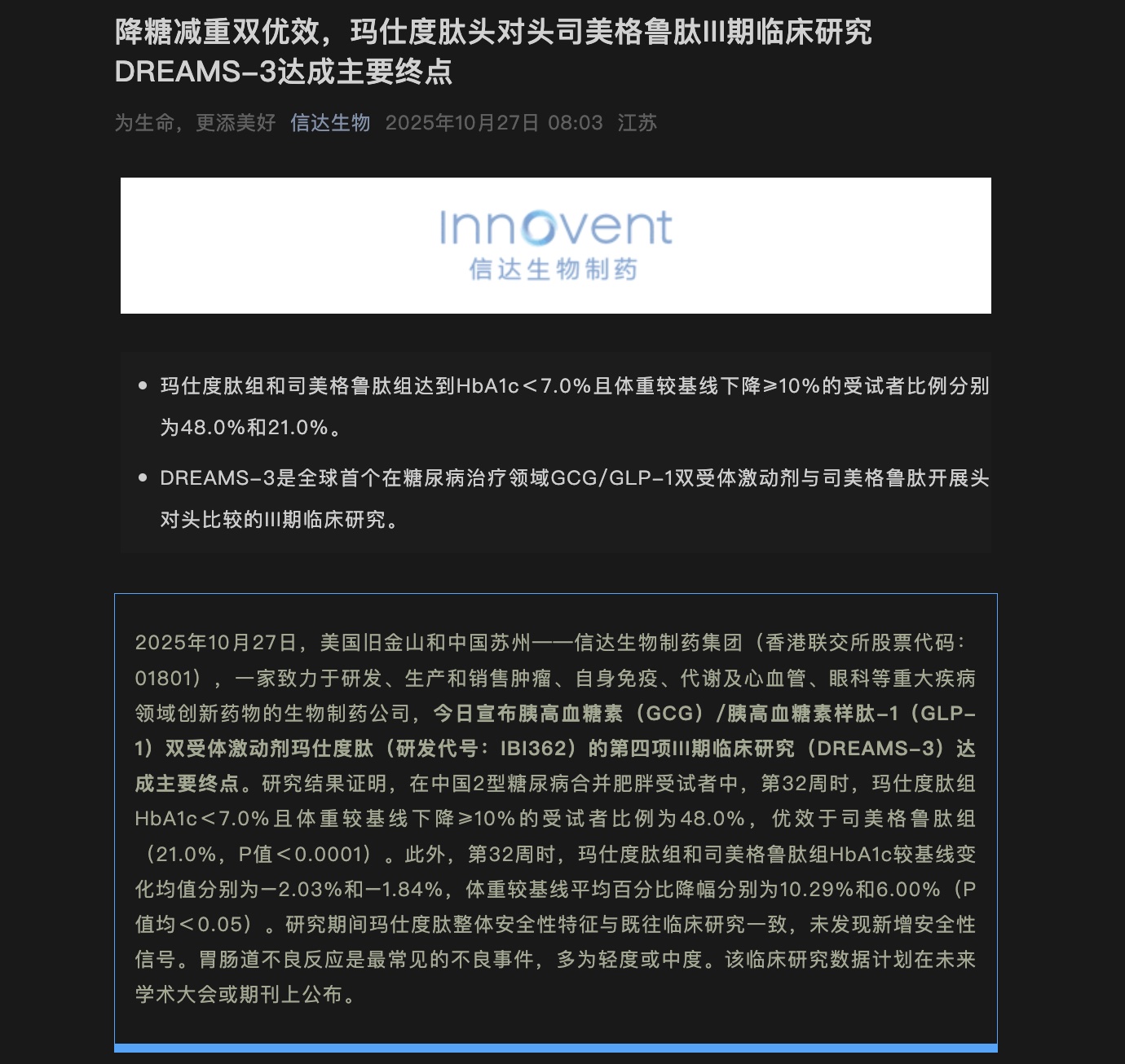 【文/观察者网 王力】 10月27日,信达生物(01801.HK)宣布,其自主研发的GCG/GLP-1双受体激动剂玛仕度肽,在关键III期临床研究DREAMS-3中成功达到主要终点。这项研究的 意义非同寻常,它是全球首个将国产同类药物与跨国药企巨头诺和诺德的"药王"司美格鲁肽进行直接对比的III期临床试验。 结果显示,在中国2型糖尿病合并肥胖患者中,玛仕度肽在"血糖控制"与"体重管理"这一综合疗效指标上,取得了统计学意义上的显著优势。具体数据显 示,近半数(49.7%)接受玛仕度肽治疗的患者同时实现了血糖达标和体重下降超过10%,这一比例是司美格鲁肽组(21.0%)的两倍以上。 这不仅是一次临床数据的胜利,更是一个强烈的市场信号:长期由诺和诺德、礼来等国际巨头主导的GLP-1市场铁幕,已被国产创新药撕开一道缺口。此次 胜利极大地提振了行业信心,证明了本土药企有能力研发出在核心疗效上媲美甚至超越全球重磅产品的创新药,为中国在代谢疾病这一巨大市场中争夺话语 权奠定了坚实的基础。 头对头试验证实临床优效,国产药物破局"信任壁垒" 截图来自信达生物公众号 这一数据具有深刻的临床价值。北京大学人民医院内分泌科主任纪立农 ...